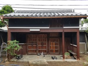 「築200年の旧家」 外壁:焼板+漆喰仕上げ 屋根:淡路産いぶし瓦 内壁:腰 杉板+柿渋塗り / 腰上 漆喰仕上げ 木製建具:電気錠 土間:三和土仕上げ+御影石 「門改修工事」 梁が白蟻により腐食の為一旦全て解体 解体後、腐食部新設 (解体前) (工事中) (完成)